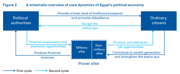 وفي مصر، لا تُعدّ الأوضاع الاقتصادية جزءاً من العقد الاجتماعي فحسب، بل يُنظر إليها أيضا على نطاق أوسع بوصفها نتيجةً مباشرة لسياسات السيسي والمؤسسة العسكرية. فمنذ الانقلاب، قاد النظام عملية عسكرة الاقتصاد، “مُزيحاً القطاع الخاص عبر مشروعات تقودها المؤسسة العسكرية، ليصبح الاقتصاد صورة للنخبة الحاكمة التي يهيمن عليها العسكريون”.[24] كما أنّ الوضع الاقتصادي حاسم للحفاظ على قدرة النظام على تلبية المصالح المالية للنخبة الحاكمة في الجيش، وبالتالي صون بنية النظام واستقراره.
