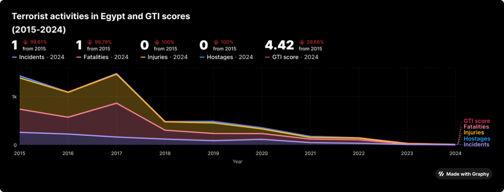 وسجلت مصر في 2021، وفقا لمؤشر الإرهاب العالمي، فإن أحد أكبر الانخفاضات في الوفيات الناجمة عن الإرهاب؛ وفي منطقة الشرق الأوسط وشمال إفريقيا (2020–2021)، جاءت مصر بعد سوريا مباشرة، مسجلة ثاني أفضل تحسّن، حيث انخفضت الوفيات من 119 في 2020 إلى 66 في 2021، أي بتراجع يزيد على 44 بالمئة.[21] ويمكن التقاط ذلك رسميا في قرار السيسي رفع حالة الطوارئ عام 2021 للمرة الأولى منذ إعلانها.[22] وبحلول عام 2024، سجّلت مصر هجوما واحدا أسفر عن وفاةٍ واحدة.[23]