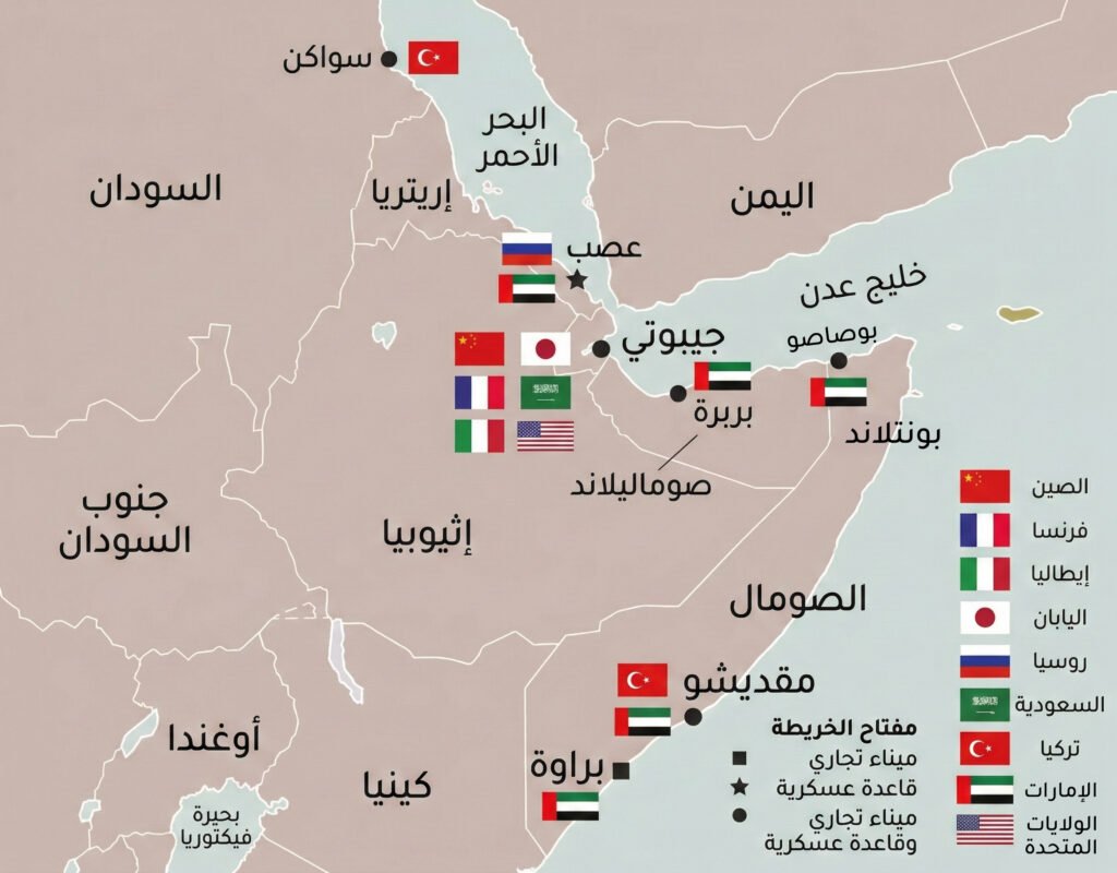 | الإمارات | مصالح جيو-اقتصادية، السيطرة على طرق التجارة | الاستثمار في الموانئ وقطاع الخدمات اللوجستية، حضور أمني محدود، بناء علاقات مع الأنظمة المحلية، ممارسة نفوذ دبلوماسي |